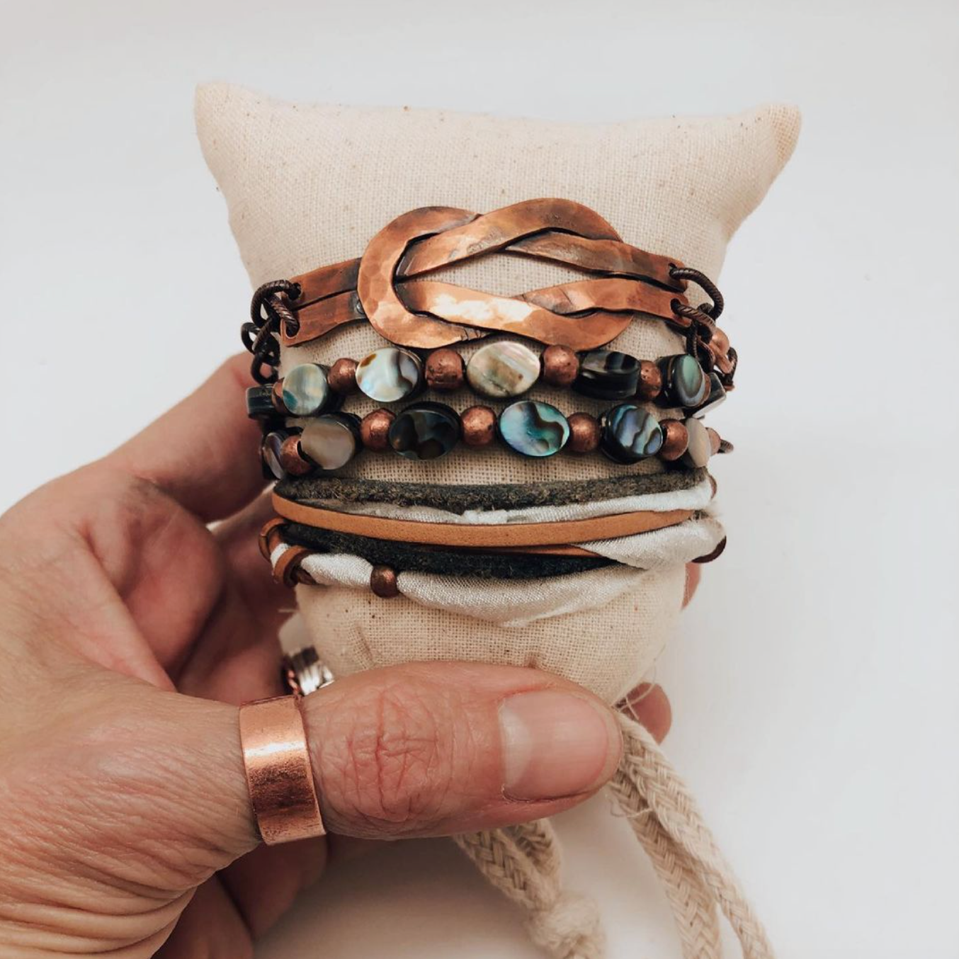 Shauna began to work primarily with coppers for their warmth and ability to age well, as they develop a patina color and texture. From this experimentation, she found ways to make her jewelry more functional and versatile.
